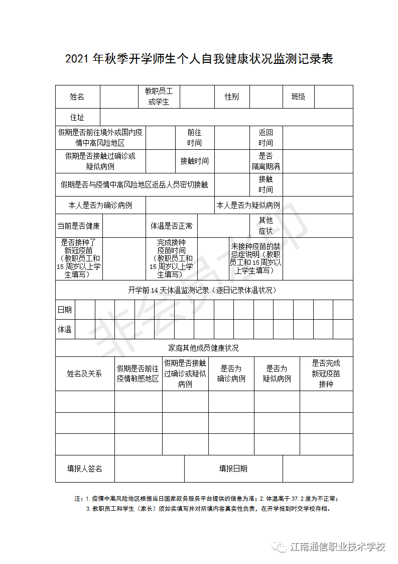 開學(xué)時(shí)請攜帶紙質(zhì)2021年秋季開學(xué)師生個(gè)人自我健康狀況監(jiān)測記錄表格上交學(xué)校。